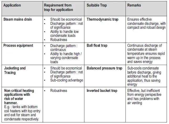 Given below is a guide for selecting the correct type of trap for major applications.