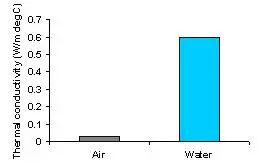 As seen in the graph the thermal conductivity of water at ambient temperature is 0.6 and that of air is 0.025 W/m°C.