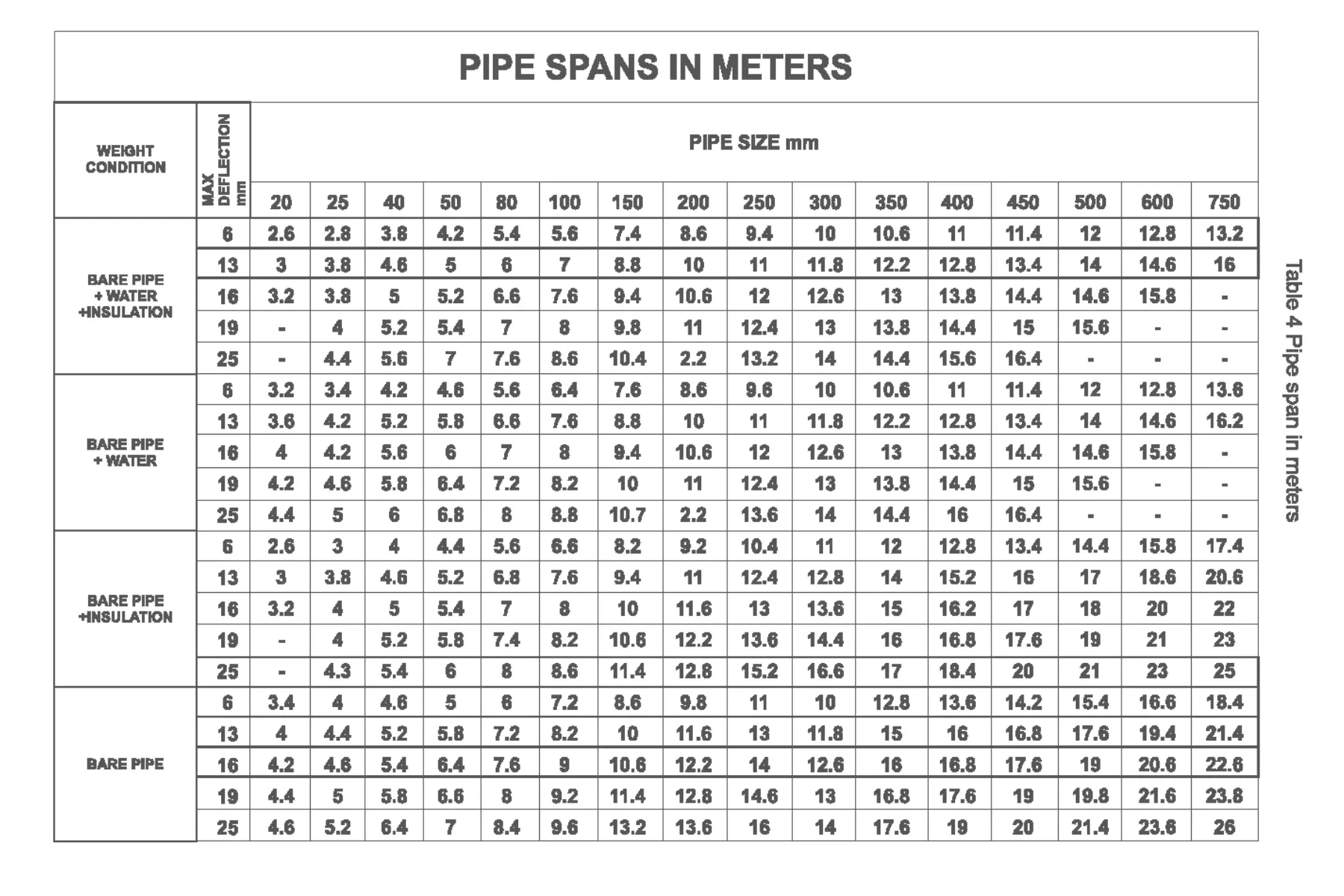 Accumulated condensate leads to wet steam and water hammer. The recommended support span for steam pipelines is as follows:
