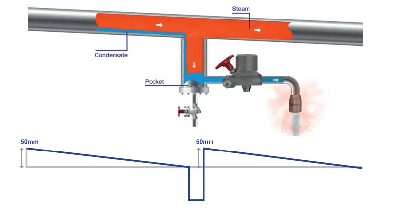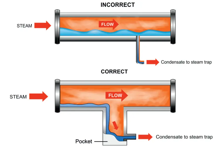 Correctly sized drain pockets should be provided to capture condensate formed in the lines so that it can reach the steam trap and be effectively evacuated.