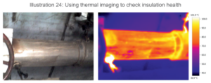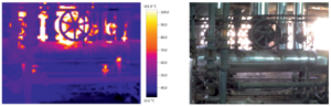 A typical output of a thermal imaging camera is illustrated below. There is no way of knowing that the insulation health needs to be addressed simply by looking at the steam line. However, a thermographic analysis indicates that the surface temperature exceeds 70C.