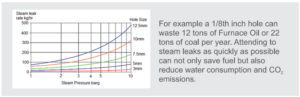For example a 1/8th inch hole can waste 12 tons of Furnace Oil or 22 tons of coal per year. Attending to steam leaks as quickly as possible can not only save fuel but also reduce water consumption and CO2 emissions.