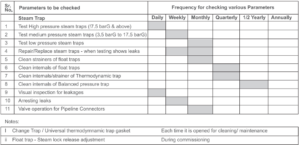Steam traps installed in the distribution network can fail due to several reasons including improper selection, installation and maintenance. Implementing an effective steam trap maintenance program steam traps. helps sustain uptime. The table below illustrates the periodic maintenance schedule to be followed for steam traps.
