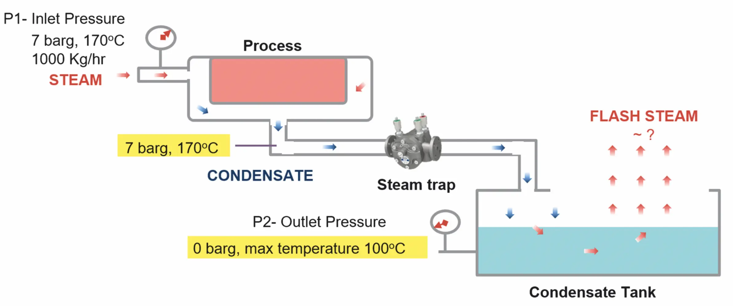 In the above illustration, steam at 7barg is supplied to a process equipment. The condensate is collected in an open tank.