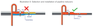 Select and install pipeline fittings like reducers and strainers correctly to avoid accumulation of water. For example, for horizontal steam lines, always use eccentric