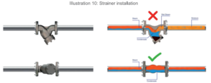 Similarly strainers should always be installed correctly to avoid condensate build-up due to debris accumulation.