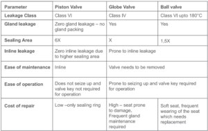 Several types of valves available for isolation. However, piston valves are the best choice for steam and condensate applications (see the comparison table below).
