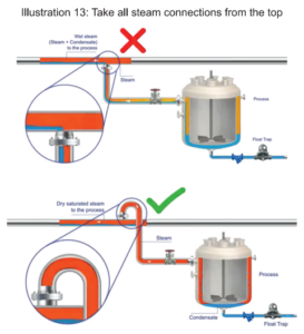Any steam tapping or connection to the steam line should always be taken from the top of the steam pipelines. When connections are taken from the side or the bottom, condensate and dirt/debris present in the line will be carried along through the pipelines, resulting in wet and dirty steam reaching the process equipment.